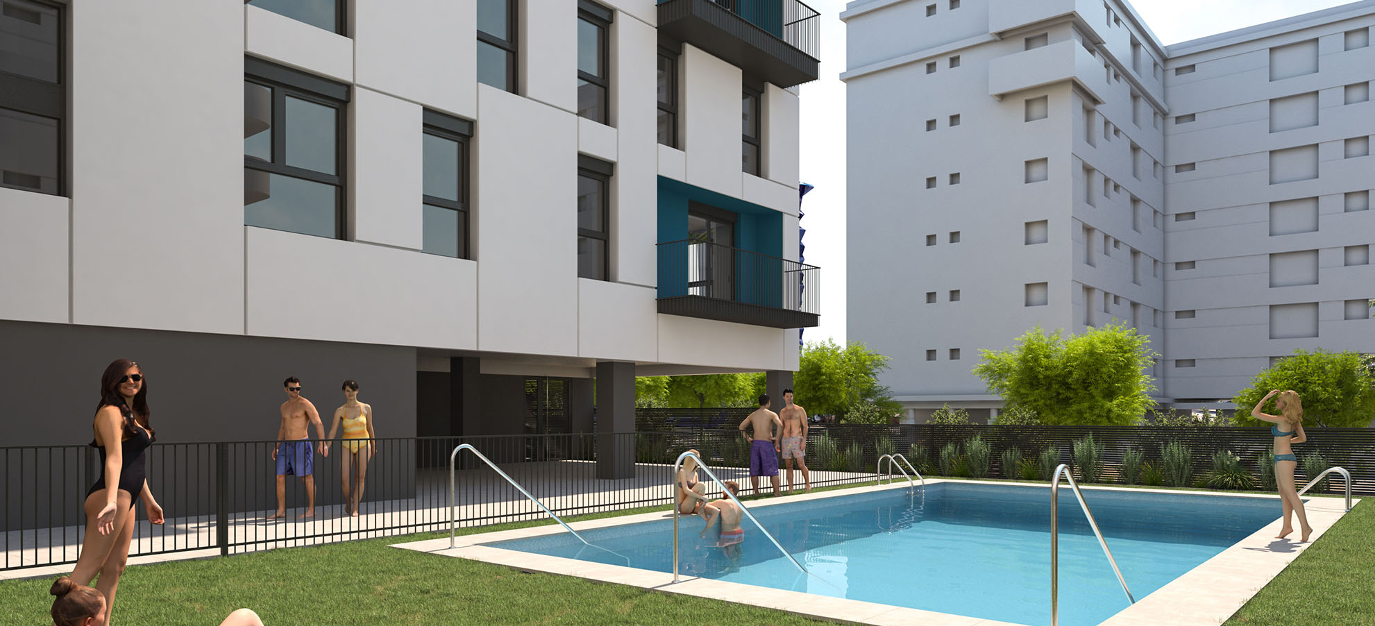 La promoción cuenta con una zona residencial de disfrute común, destacando la piscina de planta baja, con aseos anexos y una sala polivalente para disfrute de la comunidad.
